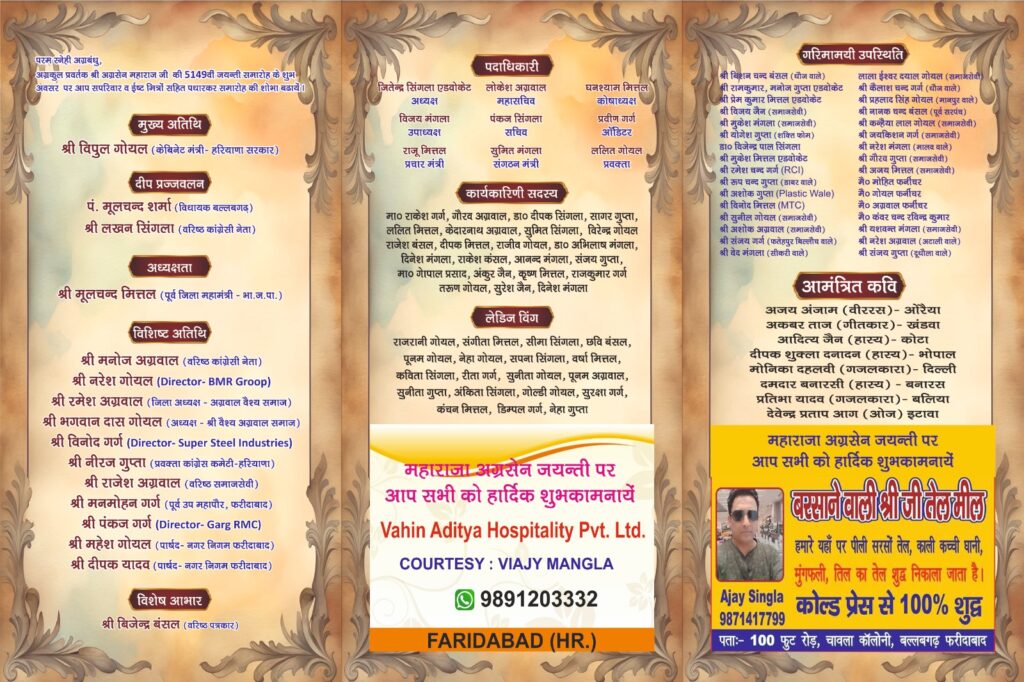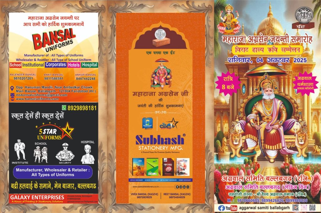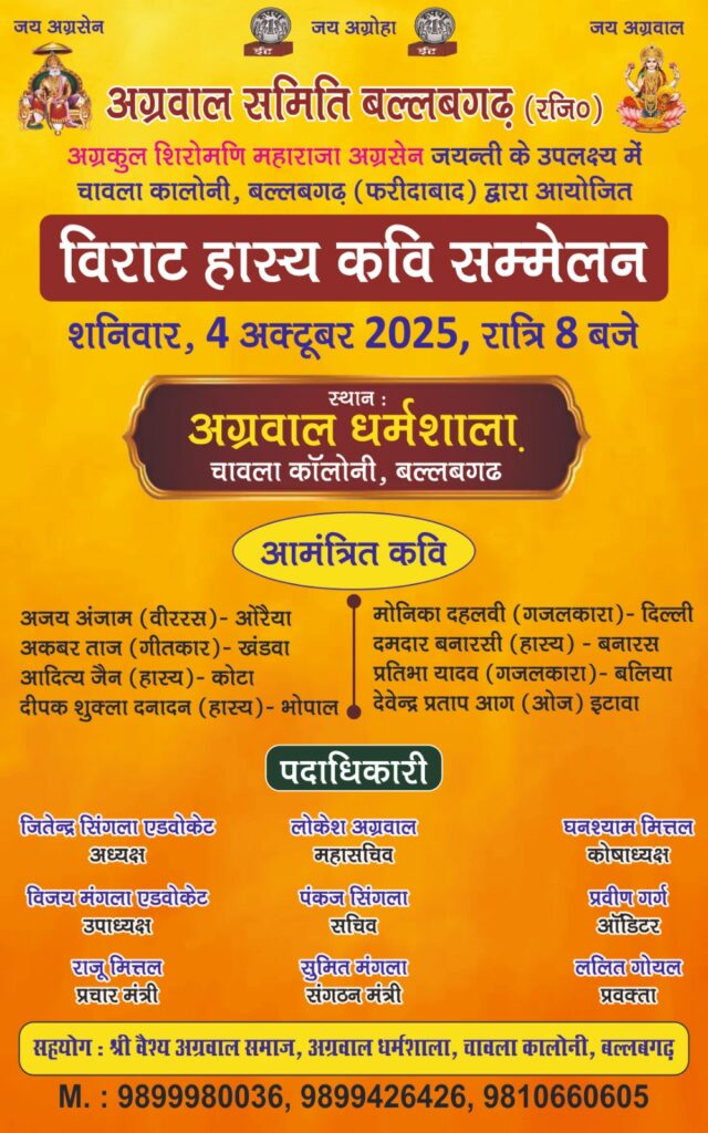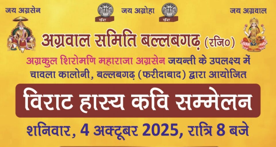 बल्लभगढ़, 3 अक्टूबर: अग्रकुल प्रवर्तक महाराजा अग्रसेन की 5149वीं जयंती पर अग्रवाल समिति बल्लभगढ़ द्वारा शनिवार, 4 अक्टूबर को विराट हास्य कवि सम्मेलन का आयोजन किया जाएगा। गत रात्रि कवि सम्मेलन की तैयारियों को लेकर समिति की एक विशेष बैठक आयोजित की गई।