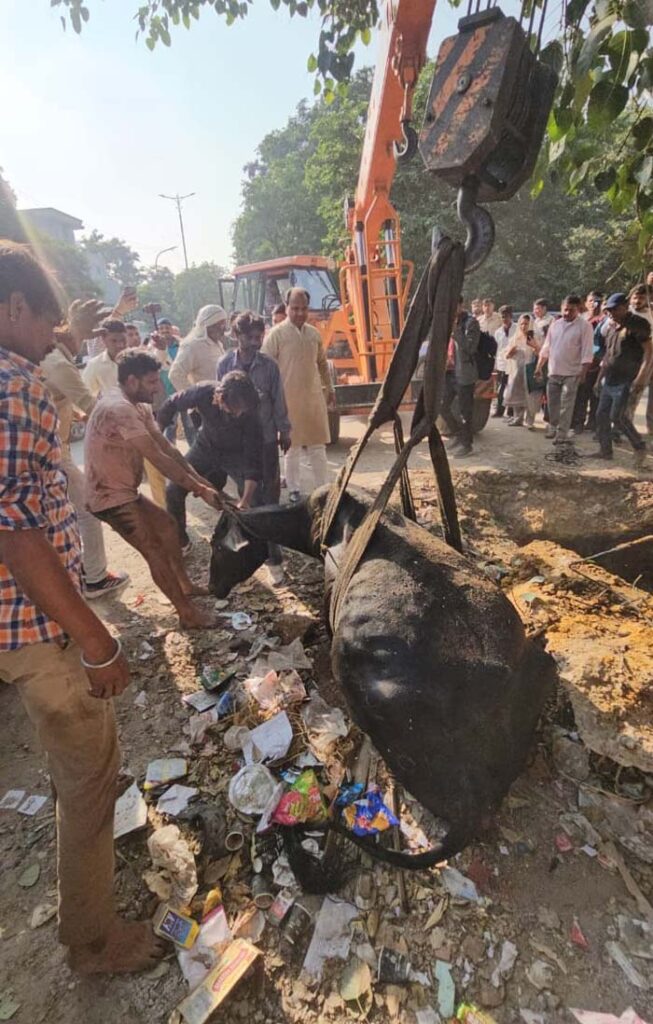 Faridabad News, 4 नवंबर: सैक्टर-12 में बने एक गडड़े में गिरी गऊ माता को शहर के वरिष्ठ समाजसेवी सुमित गौड़ व गौभक्तों के प्रयासों से घंटों की मशक्कत के बाद सकुशल बाहर निकाला गया। गड्ढे से बाहर निकाली गई गऊ माता फिलहाल ठीक है, परंतु इस घटना ने एक बार फिर से भाजपा सरकार के विकास के दावों की पोल पूरी तरह से खोलकर रख दी है।