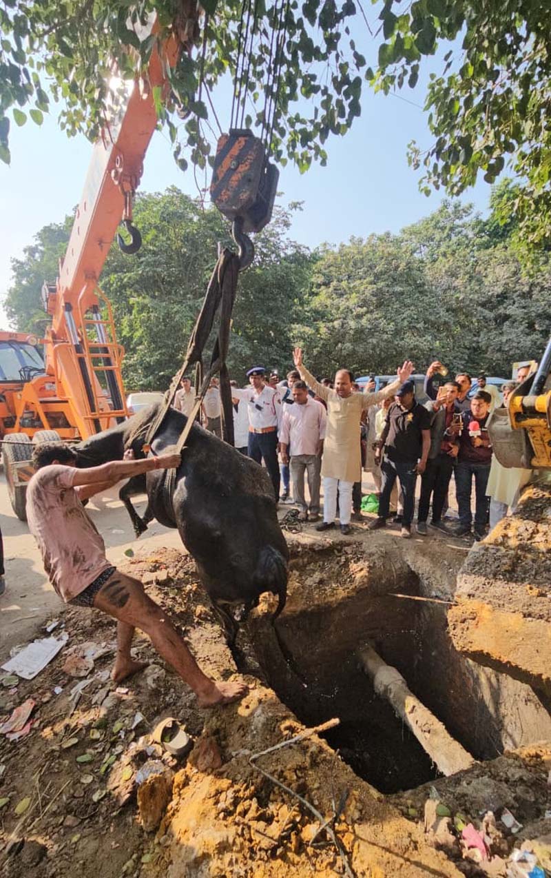 Faridabad News, 4 नवंबर: सैक्टर-12 में बने एक गडड़े में गिरी गऊ माता को शहर के वरिष्ठ समाजसेवी सुमित गौड़ व गौभक्तों के प्रयासों से घंटों की मशक्कत के बाद सकुशल बाहर निकाला गया। गड्ढे से बाहर निकाली गई गऊ माता फिलहाल ठीक है, परंतु इस घटना ने एक बार फिर से भाजपा सरकार के विकास के दावों की पोल पूरी तरह से खोलकर रख दी है।