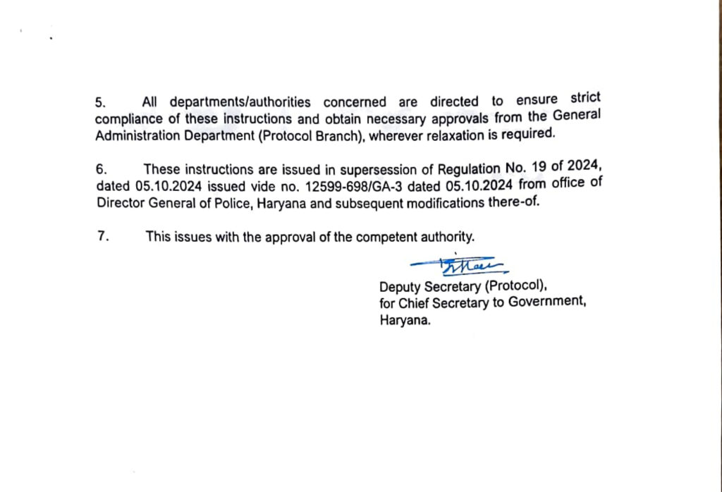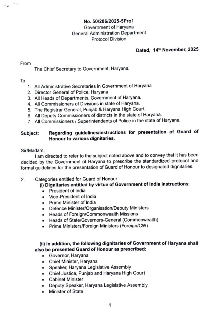 हरियाणा सरकार ने प्रदेशभर में गणमान्य व्यक्तियों को दिए जाने वाले गार्ड ऑफ ऑनर देने के सम्बन्ध में जो नए निर्देश जारी किए हैं। उनका उद्देश्य प्रोटोकॉल से जुड़ी प्रक्रियाओं में एकरूपता, स्पष्टता और अनुशासन सुनिश्चित करना है ताकि सभी विभागों, जिला प्रशासन एवं पुलिस द्वारा निर्धारित मानकों का एक समान पालन किया जा सके।