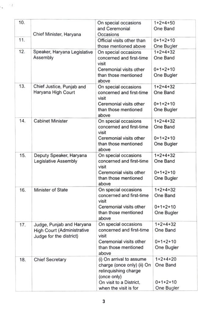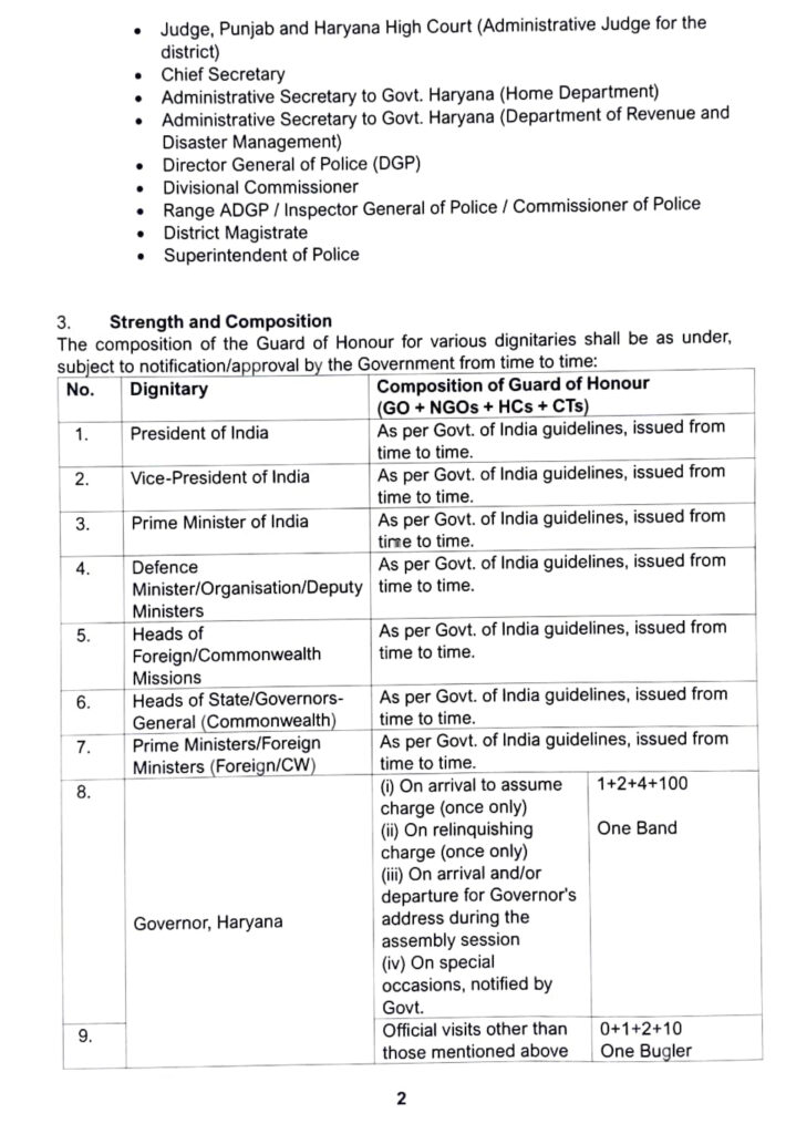 अधिसूचना में प्रत्येक गणमान्य व्यक्ति के लिए निर्धारित अवसरों पर गार्ड ऑफ ऑनर की संख्या और संरचना स्पष्ट रूप से निर्धारित की गई है। अब हर विजिट पर सलामी नहीं मिलेगी। उदाहरणस्वरूप, हरियाणा के राज्यपाल को कार्यभार ग्रहण, कार्यभार से मुक्त होने, विधानसभा सत्र के दौरान अभिभाषण तथा अन्य विशेष अवसरों पर 1 राजपत्रित अधिकारी, 2 अराजपत्रित अधिकारी, 4 हेड कांस्टेबल और 100 कांस्टेबल सहित पूर्ण बैंड के साथ गार्ड ऑफ ऑनर दिया जाएगा। सामान्य आधिकारिक यात्राओं के दौरान 1 अराजपत्रित अधिकारी, 2 हेड कांस्टेबल, 10 कांस्टेबल और एक बग्लर द्वारा गार्ड ऑफ ऑनर देने का प्रावधान किया गया है। इसी प्रकार की संरचना मुख्यमंत्री, मुख्य न्यायाधीश, विधानसभा अध्यक्ष, मंत्रीगण तथा वरिष्ठ प्रशासनिक अधिकारियों के लिए भी निर्धारित की गई है।