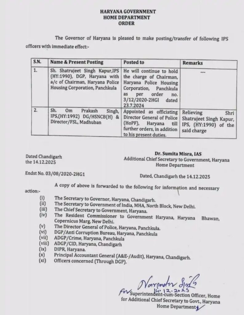 Chandigarh, 16 दिसंबर: हरियाणा सरकार के गृह विभाग की अतिरिक्त मुख्य सचिव (ACS) डॉ. सुमिता मिश्रा द्वारा जारी आदेश में प्रदेश के निवर्तमान DGP (प्रदेश पुलिस फोर्स प्रमुख) शत्रुजीत कपूर जो पिछले दो माह अवकाश पर रहे, उन्हें ताजा तैनाती हरियाणा पुलिस हाउसिंग कारपोरेशन के चेयरमैन के तौर पर दी गई है। जबकि गत् दो माह से प्रदेश के कार्यवाहक DGP ओपी सिंह जिनके पास हालांकि मुख्य चार्ज हरियाणा स्टेट नारकोटिक्स कण्ट्रोल ब्यूरो के महानिदेशक और डायरेक्टर FSL का है, आगामी आदेशों तक कार्यवाहक DGP बने रहेंगे। वैसे ओपी सिंह की IPS से रिटायरमेंट इसी IPS से सेवानिवृत्त होंगे।