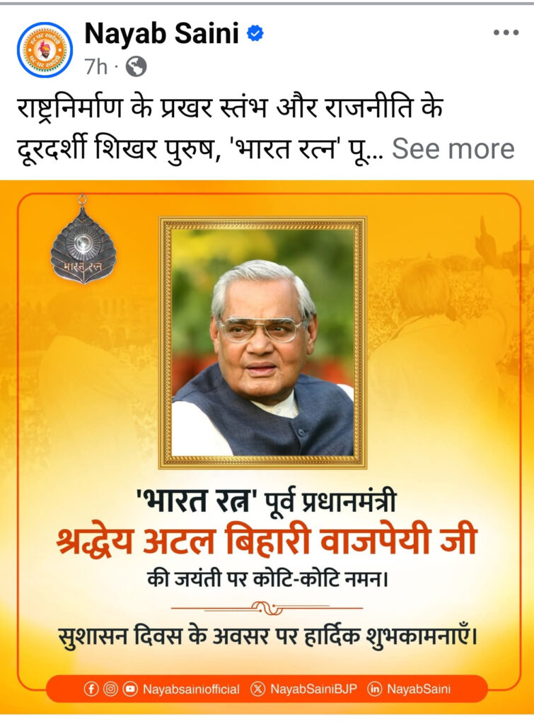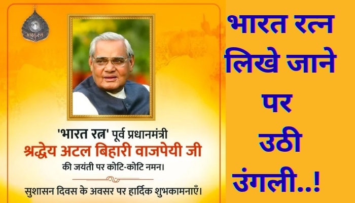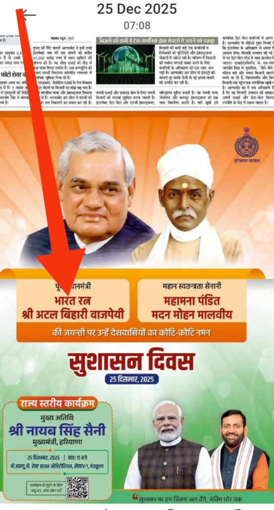 Chandigarh, 25 दिसंबर: देश के पूर्व प्रधानमंत्री अटल बिहारी वाजपेयी के नाम से पहले ‘भारत रत्न’ लगाए जाने पर उंगली उठनी शुरू हो गई है। इस मामले में हरियाणा प्रदेश के मुख्यमंत्री एवं लोक संपर्क विभाग के महानिदेशक एवं अन्य वरिष्ठ अधिकारियों को ई-मेल भेजकर और विभाग के एक्स-हैंडल पर पोस्ट कर पुन: यह मामला उठाया गया है। कहा जा रहा है कि भारत रत्न से अलंकृत व्यक्ति के नाम के आगे ऐसा उल्लेख नहीं किया जा सकता है जैसा कि उक्त विभाग ने आज 25 दिसम्बर, 2025 को सुशासन दिवस पर सरकारी विज्ञापन में प्रकाशित करवाया है जिसमें अटल बिहारी वाजपेयी के नाम के आगे ‘भारत रत्न’ का प्रयोग किया गया है।
