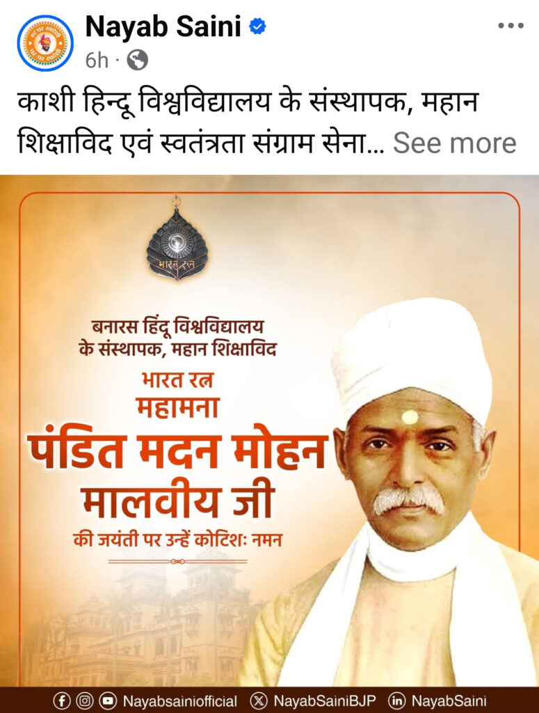 इसी विज्ञापन में महान स्वतंत्रता सेनानी महामना पंडित मदन मोहन मालवीय का भी उल्लेख है जिनकी जयंती भी आज ही है। हालांकि मालवीय को भी वाजपेयी जी की तरह मरणोपरांत ‘भारत रत्न’ के सम्मान से वर्ष 2015 में नवाजा गया था। हालांकि आज प्रकाशित विज्ञापन में मालवीय के नाम के समक्ष ‘भारत रत्न’ का उल्लेख नहीं किया गया है बल्कि ’महामना पंडित’ का उल्लेख किया गया है। हालांकि हरियाणा के मुख्यमंत्री नायब सिंह सैनी ने अपने फेसबुक पेज पर जो पोस्ट डाली है उसमें उन्होंने अटल बिहारी वाजपेयी और महामना पंडित मदन मोहन मालवीय के नाम से पहले ‘भारत रत्न’ का उल्लेख किया है।