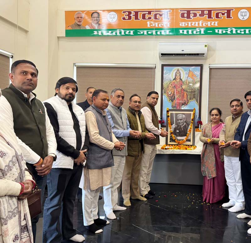 Faridabad News, 25 दिसंबर: भारतीय जनता पार्टी फरीदाबाद जिला अध्यक्ष पंकज पूजन रामपाल की अध्यक्षता एवं कार्यक्रम जिला संयोजक ओमप्रकाश रक्षवाल के संयोजन में भाजपा कार्यकर्ताओं व जनप्रतिनिधियों द्वारा भारत रत्न अटल बिहारी वाजपेयी की 101वीं जन्म जयंती भाजपा जिला कार्यालय अटल कमल पर उनके चित्र पर पुष्पांजलि अर्पित कर सुशासन दिवस के रूप में मनाई।