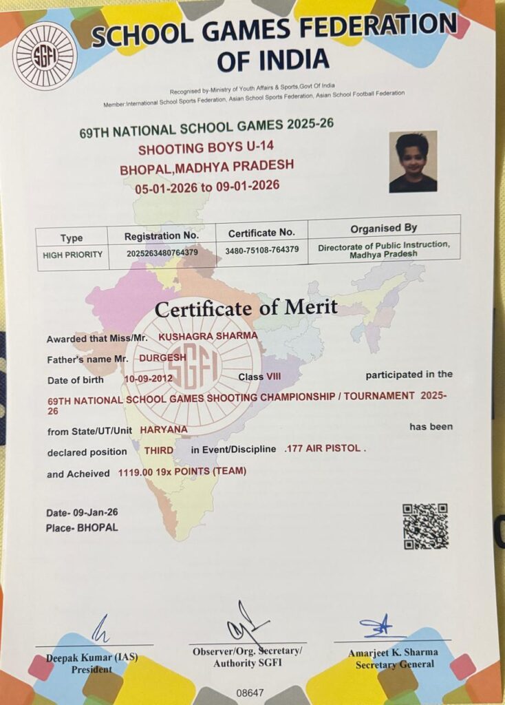 इस प्रतिष्ठित प्रतियोगिता में .177 एयर पिस्टल इवेंट के टीम इवेंट में विद्यासागर इंटरनेशनल स्कूल के छात्र कुशाग्र शर्मा ने शानदार प्रदर्शन करते हुए तृतीय स्थान (तीसरा स्थान) प्राप्त कर विद्यालय, परिवार और क्षेत्र का नाम रोशन किया। कुशाग्र शर्मा ने अपनी टीम के साथ मिलकर कुल 1119.00 अंक (19x) अर्जित किए, जो उनके अनुशासन, निरंतर अभ्यास और मानसिक दृढ़ता का प्रमाण है।