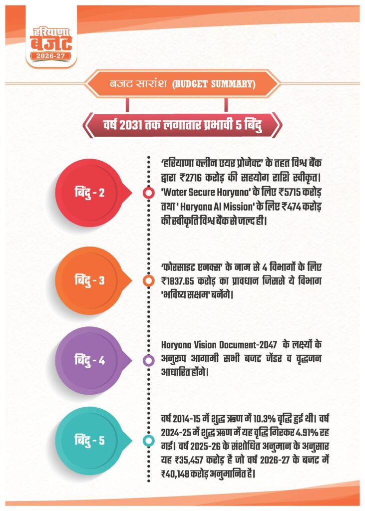 Faridabad, 2 मार्च: हरियाणा के CM नायब सिंह सैनी ने हरियाणा विधानसभा में वर्ष 2026-27 का बजट पेश करते हुए फरीदाबाद के लिए दो महत्वपूर्ण एलिवेटेड संपर्क मार्ग परियोजनाओं की घोषणा की है। इन परियोजनाओं के माध्यम से शहर के बुनियादी ढांचे को मजबूत करने और ट्रैफिक जाम की समस्या को कम करने की दिशा में बड़ा कदम उठाया गया है।