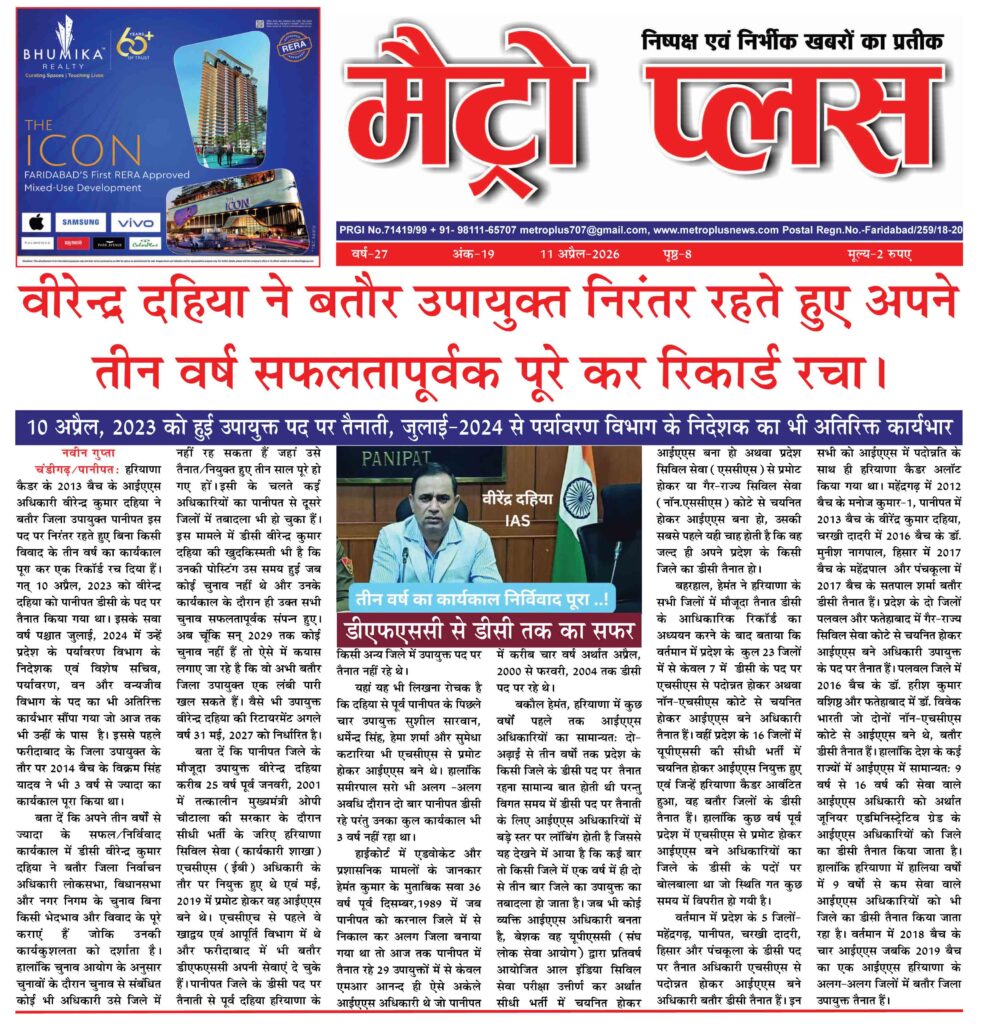 Chandigarh/Panipat, 11 अप्रैल: हरियाणा कैडर के 2013 बैच के आईएएस अधिकारी वीरेन्द्र कुमार दहिया ने बतौर जिला उपायुक्त पानीपत इस पद पर निरंतर रहते हुए बिना किसी विवाद के तीन वर्ष का कार्यकाल पूरा कर एक रिकॉर्ड रच दिया हैं। गत् 10 अप्रैल, 2023 को वीरेन्द्र दहिया को पानीपत डीसी के पद पर तैनात किया गया था। इसके सवा वर्ष पश्चात जुलाई, 2024 में उन्हें प्रदेश के पर्यावरण विभाग के निदेशक एवं विशेष सचिव, पर्यावरण, वन और वन्यजीव विभाग के पद का भी अतिरिक्त कार्यभार सौंपा गया जो आज तक भी उन्हीं के पास है। इससे पहले फरीदाबाद के जिला उपायुक्त के तौर पर 2014 बैच के विक्रम सिंह यादव ने भी 3 वर्ष से ज्यादा का कार्यकाल पूरा किया था।
