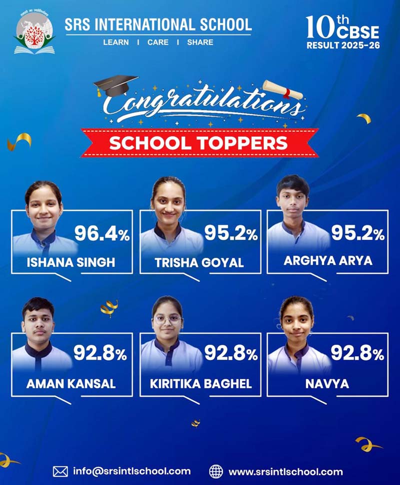 Greater Faridabad, 16 अप्रैल: SRS इंटरनेशनल स्कूल के विद्यार्थियों ने सीबीएसई के 10वीं कक्षा के परीक्षा परिणामों में शानदार प्रदर्शन करते हुए विद्यालय का नाम रोशन किया। विद्यालय का परीक्षा परिणाम शत-प्रतिशत रहा।