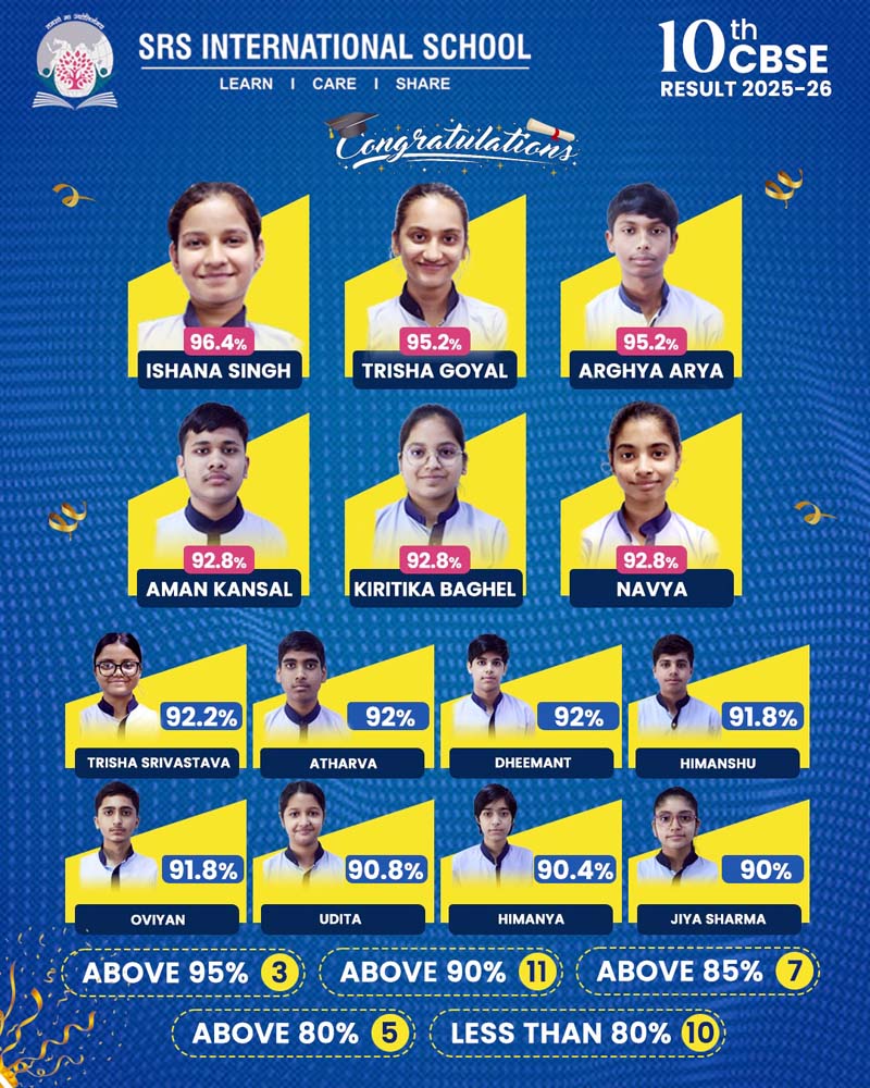 विद्यालय की छात्रा ईशाना सिंह ने 96.4 प्रतिशत अंक हासिल कर पहला स्थान प्राप्त कर विद्यालय को गौरवान्वित किया, वहीं त्रिशा गोयल और अघ्र्य आर्या ने 95.2 प्रतिशत अंकों के साथ द्वितीय और अमन कंसल, कीर्तिका बघेल और नव्या ने 92.8 प्रतिशत अंकों के साथ विद्यालय में तृतीय स्थान प्राप्त किया है।